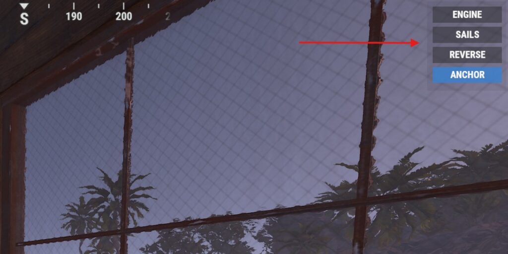 Added new Boat Commands UI. This UI (shown below) will appear when you are mounted on the steering wheel of a built boat. This will allow you to start/stop engines, deploy sails, reverse engines and sails (SEE IMPORTANT NOTE BELOW!!) and deploy the anchor. Use your mouse to click the buttons (best to open inventory view to get access to the mouse cursor).
