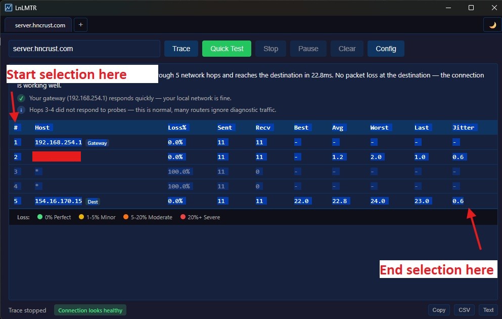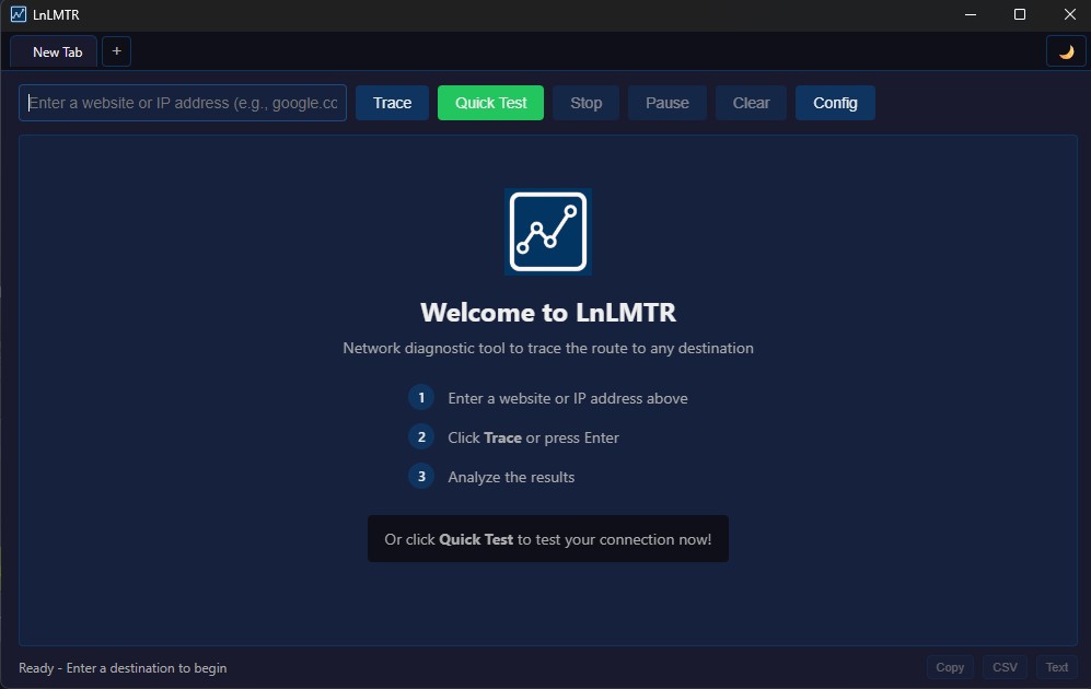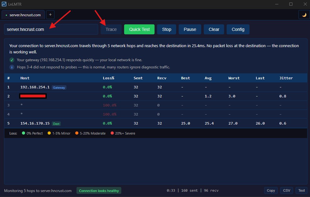 First, you will need to download an MTR program. The easiest is LnLMTR available for free on Steam. WinMTR is also available from Sourceforge here.